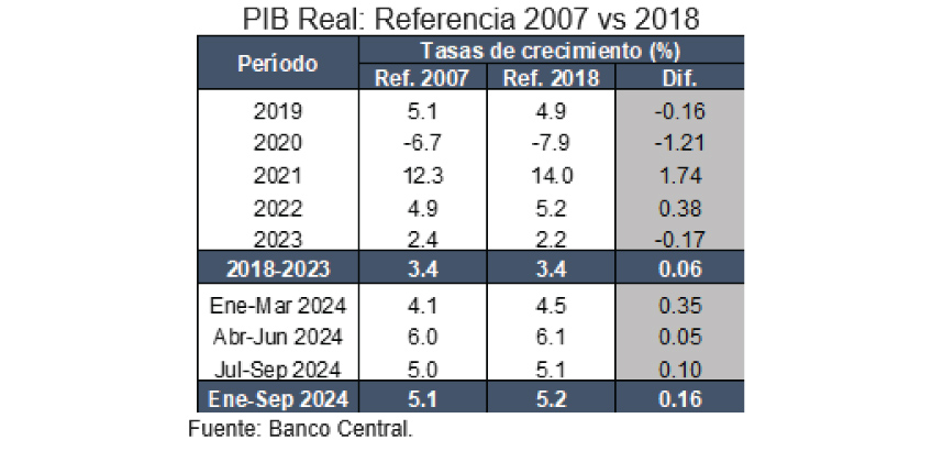 The national accounts associated with the new reference year show an average real GDP growth rate of 3.4% for the period 2018-2023, which is equal to the average real expansion reported during that five-year period using national accounts referenced to 2007.