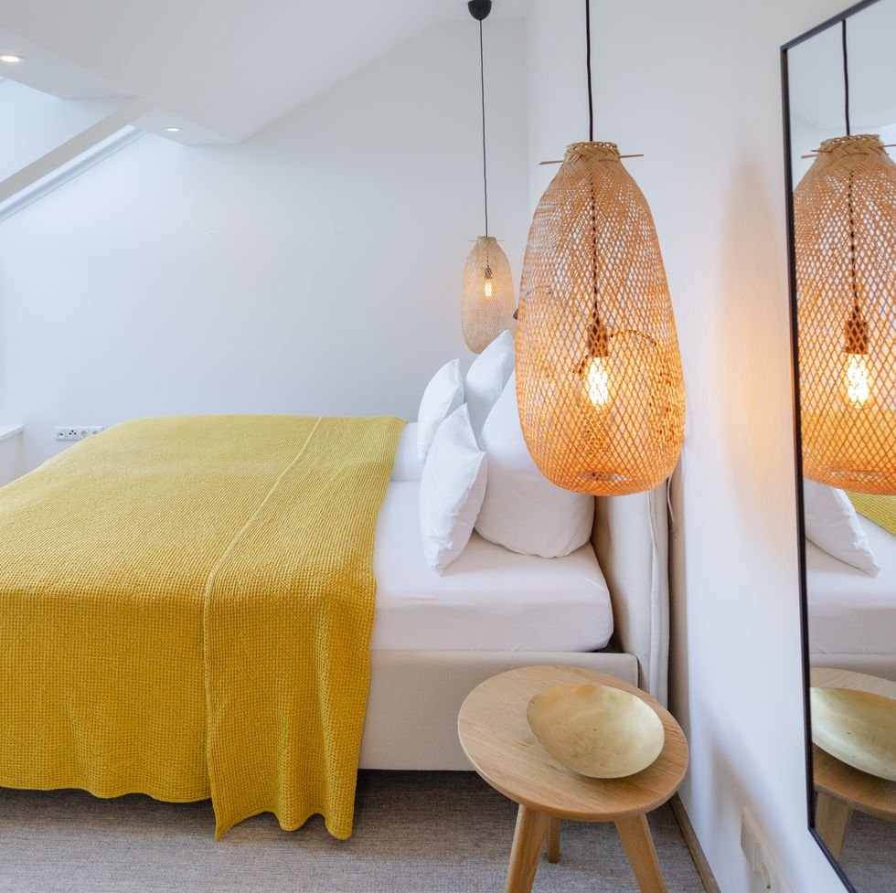 In a small bedroom, every inch counts. That's why you should choose furniture that offers more than one function. In this space, the multifunctional and super practical piece of furniture that has become essential in small bedrooms is the bed with a lift-up storage base. The extra storage space is wonderful; it allows you to store bedding, shoes, or out-of-season clothes without taking up additional room. The base is made of white wood, a neutral and light finish ideal for bedrooms of any style.