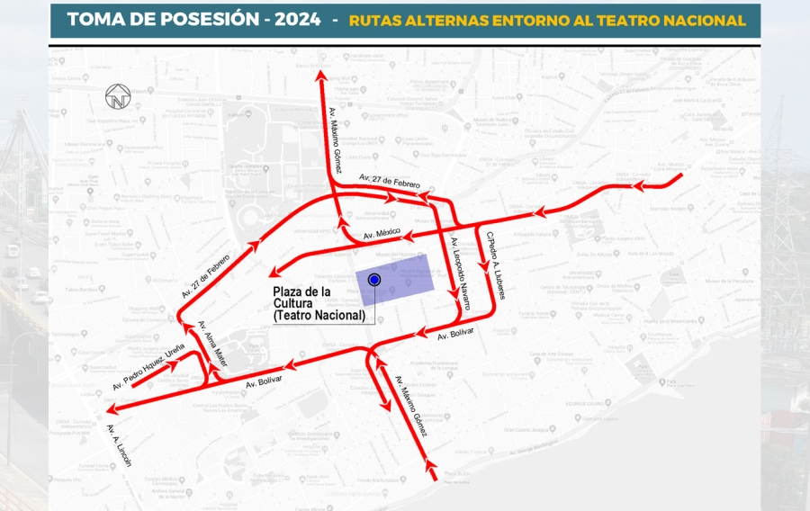 En ese sentido, la circulación de vehículos estará controlada en el entorno del Teatro Nacional, en la avenida Máximo Gómez, y el Congreso Nacional, en la Jiménez Moya, por lo cual se recomienda a la ciudadanía utilizar las avenidas Independencia, George Washington y Abraham Lincoln.