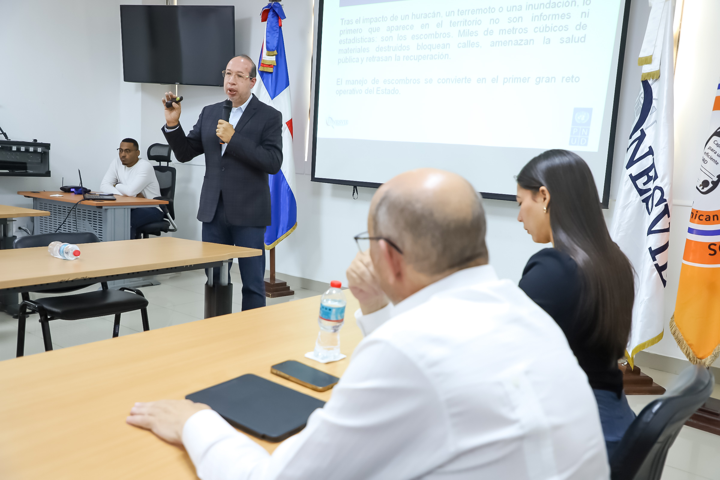 Durante el encuentro, Marcos Antonio Giraldo, asesor del PNUD, compartió con los participantes su experiencia técnica internacional en gestión de escombros, explicando modelos exitosos implementados en otros países y destacando la importancia de replicar en el país prácticas basadas en evidencia, coordinación y planificación previa al desastre.
